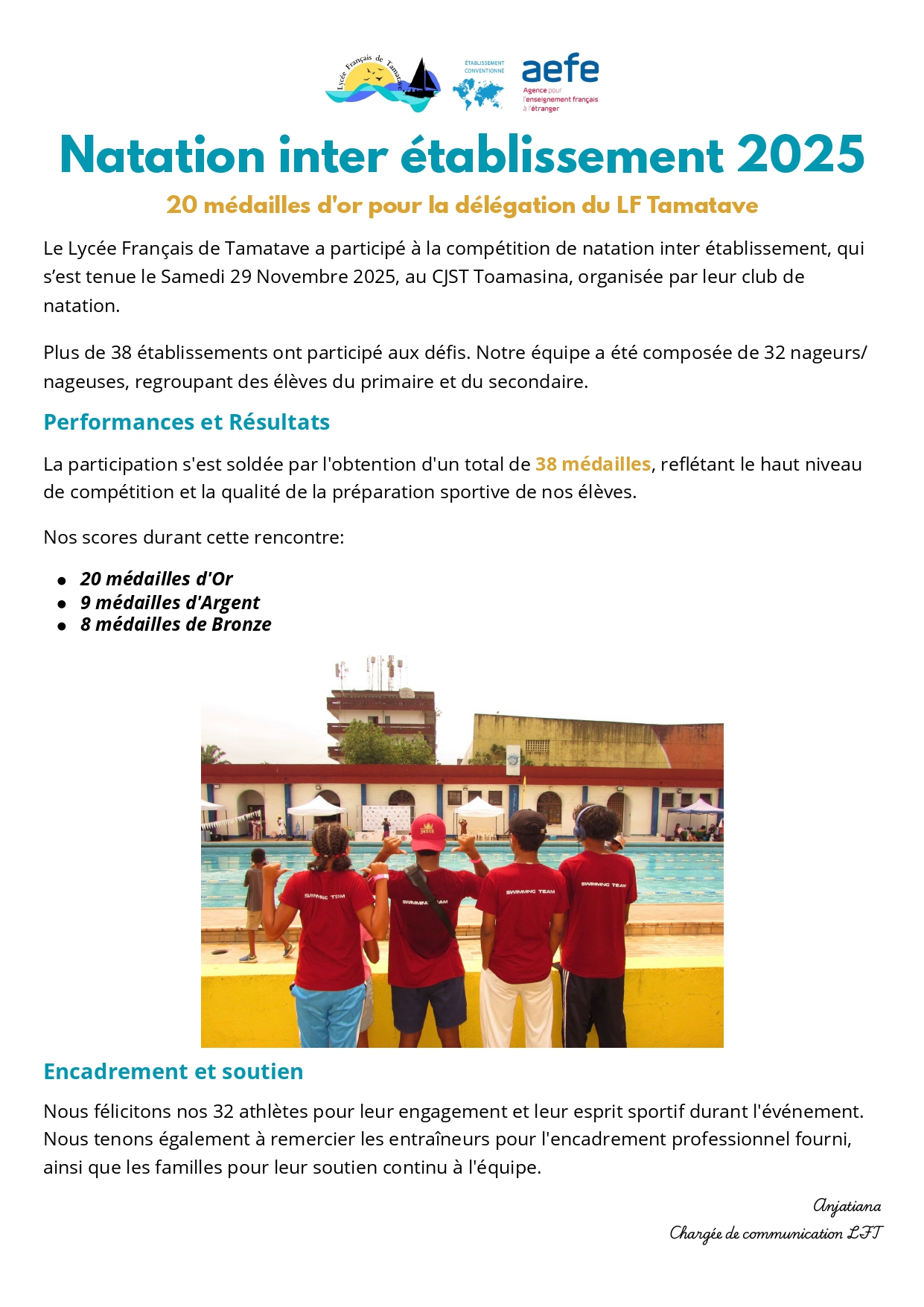 Natation inter établissement 2025 2025-12-09 par HANITSOA 20 médailles d'or pour la délégation du Lycée Français de Tamatave