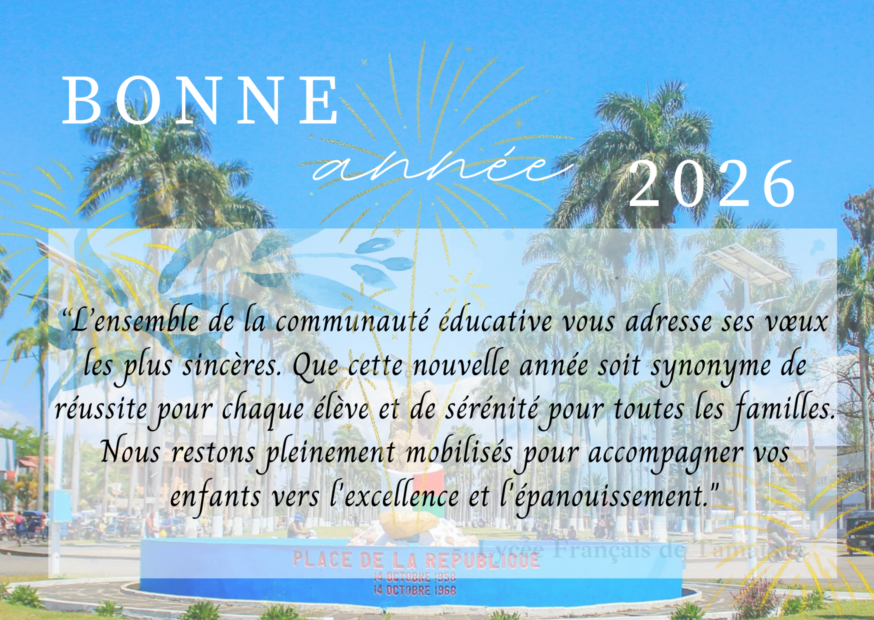 « L’avenir n’est pas ce qui va arriver, mais ce que nous allons en faire » Henri BergsonLa communauté éducative de notre Lycée vous souhaite à tous une très bonne année. Nos meilleurs vœux pour ce nouveau départ et défi individuel ou collectif.Mot du proviseur: "La cohésion est notre force, faisons un bloc autour d'une mission commune : former des citoyens libres et éclairés".C’est donc une communa ...