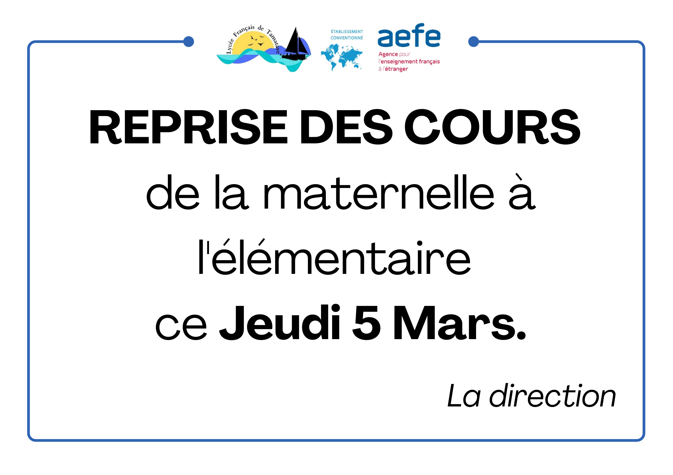 - Classes de 5ème / 2nde : mardi 25 mars 2025 à 17h00 (Dialogue + remise de bulletins)- Classes de 4ème / 3ème : jeudi 27 mars 2025 à 17h00 (Dialogue + remise de bulletins)